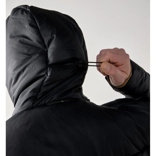 - Drawcord-adjustable insulated hood with elastic binding