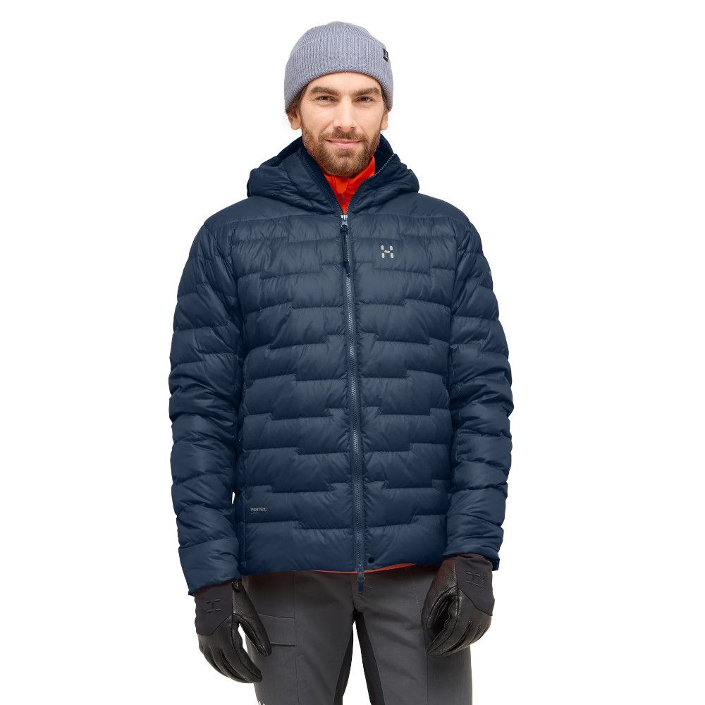 - Haglöfs H DOWN Gold 700 CUIN fillpower premium quality 85% down/15% feather, treated with fluorocarbon free DWR to keep long lasting performance even in humid conditions and to speed up drying time. Traceable and bluesign® approved. Down weight: X g (size X) Contains non-textile parts of animal origin, PERTEX QUANTUM, Woven ripstop, 100% Recycled Polyamide, 20 Denier, 35g/m2, bluesign approved., PERTEX QUANTUM, Woven rip-stop fabric, 100% Polyamide Recycled, 30 Denier, PFAS-free DWR, 50g/m2, bluesign® approved, Mimic SILVER Recycled Polyester sheet insulation 100g/m2, bluesign® approved.