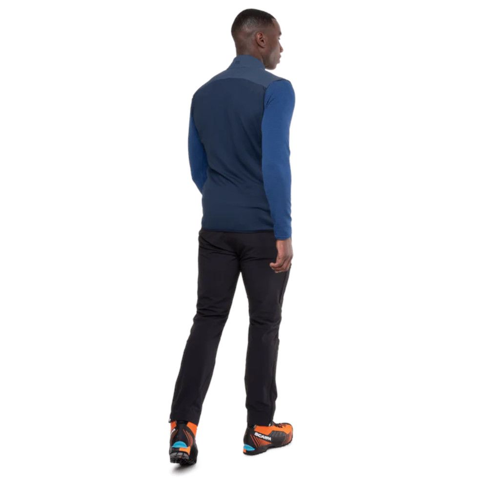 A hybrid vest with an insulated front and low-profile grid fleece back for fast moving mountain sports